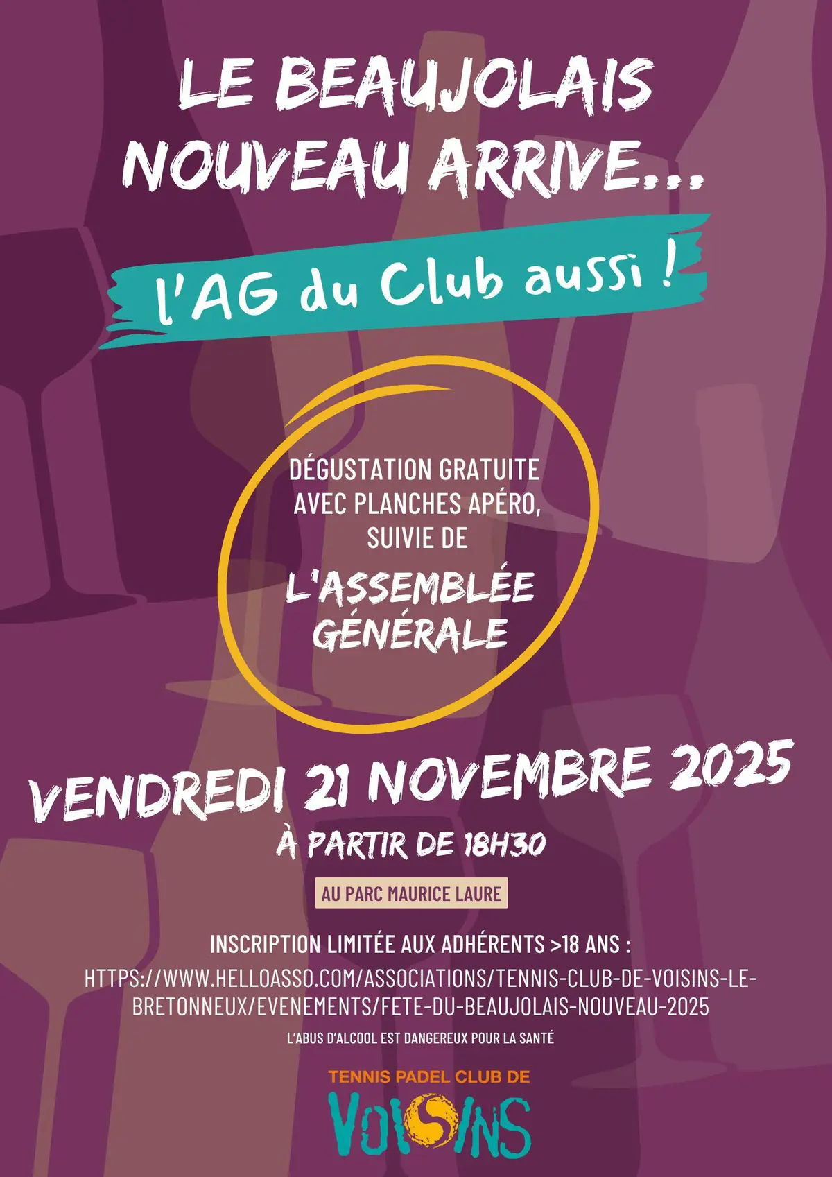 Le TC Voisins vous propose de fêter l'arrivée du Beaujolais nouveau avant l'assemblée générale annuelle🤗🥳